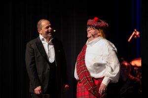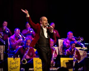 Bijgestaan door zijn rechterhand Sam Verhoeven brengt hij de ene sketch na de andere, afgewisseld door mooie liedjes en toffe bigbandmuziek.